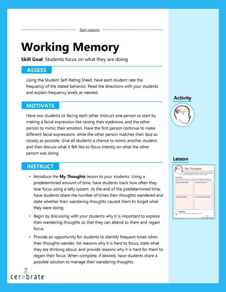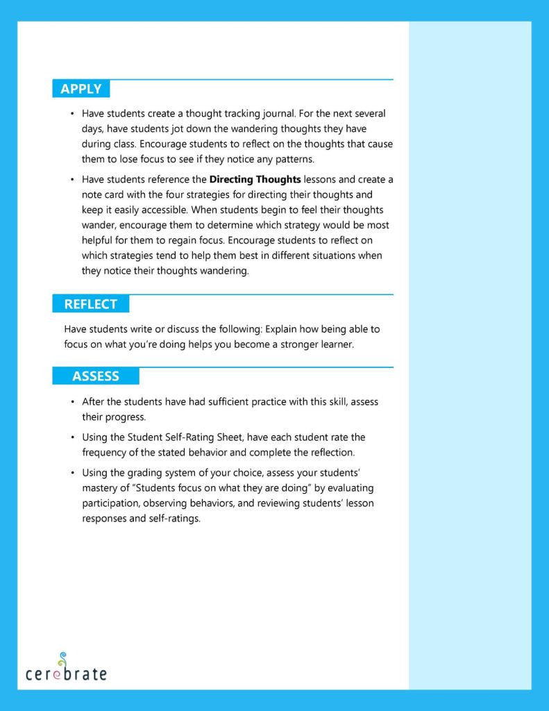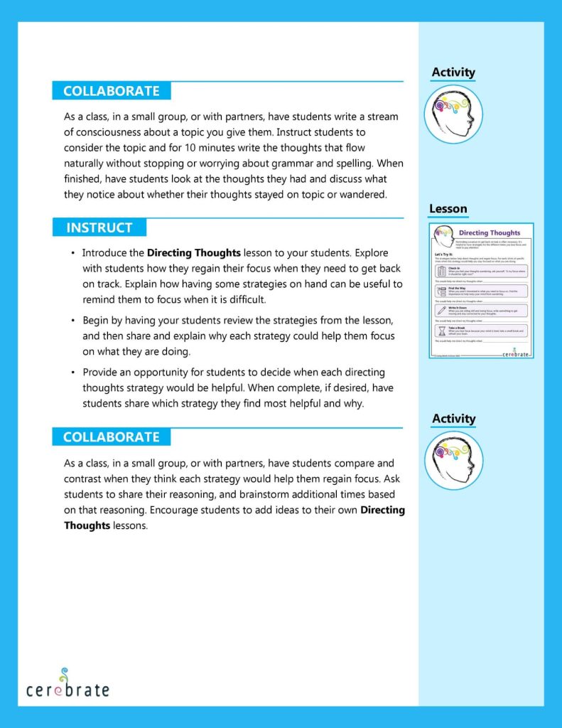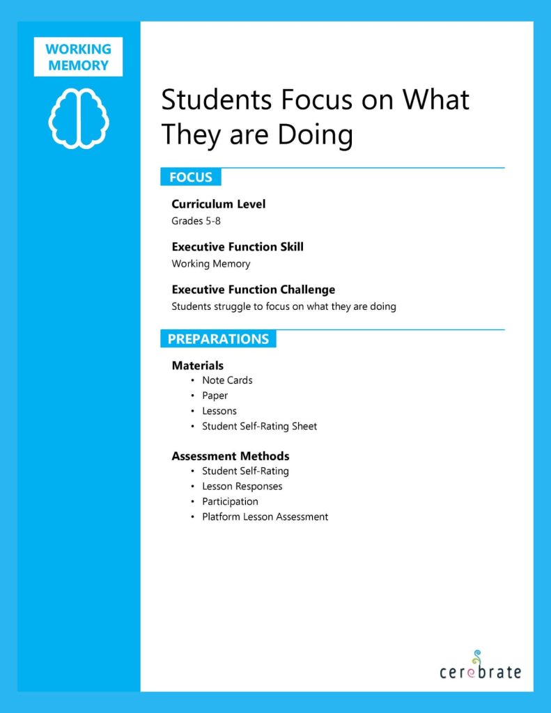 Seven key components of executive function instruction are incorporated into the Cerebrate curriculum, and they are based on the leading research in the field. As you look at the lessons, you will notice the following best practices: