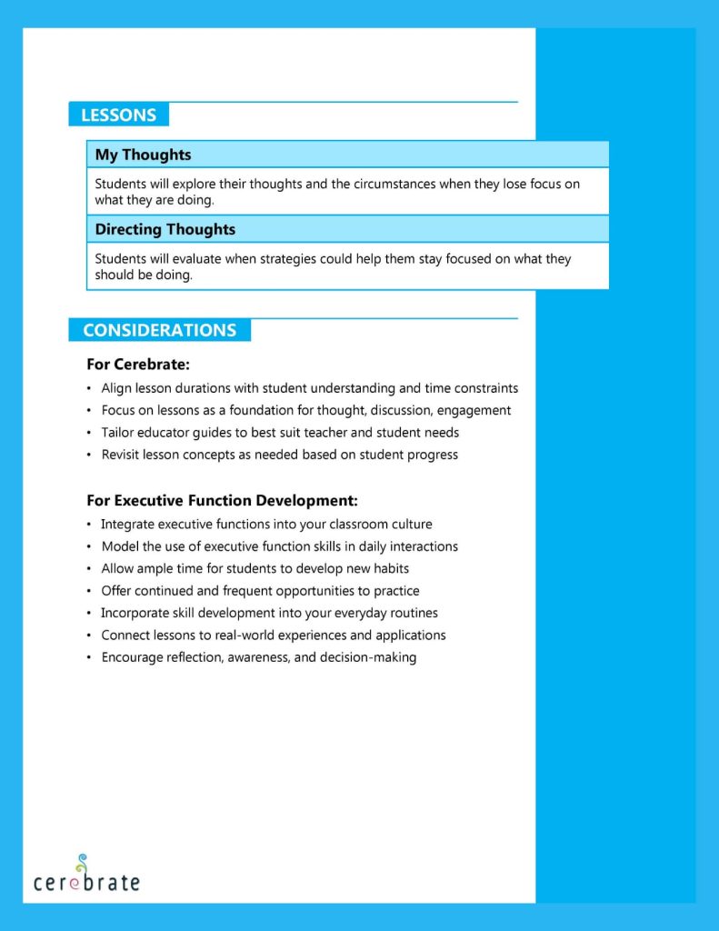 Cerebrate’s executive function lessons help students build self-awareness, increase engagement, develop critical thinking, strengthen pro