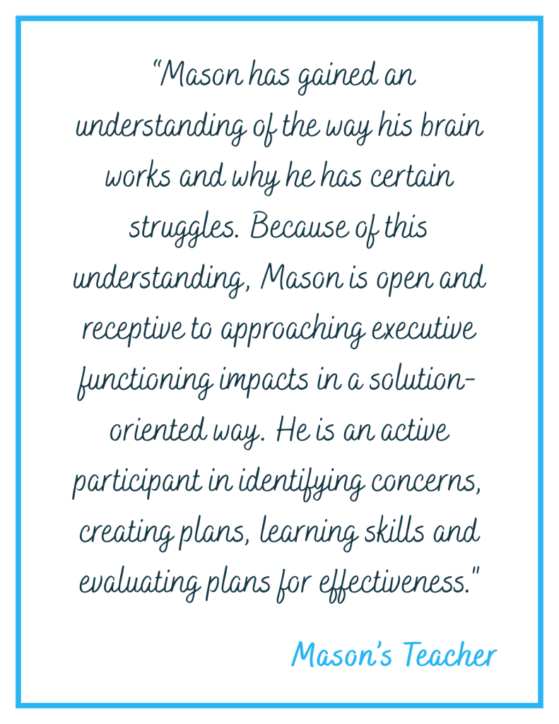 Mason had difficulty monitoring his work and understanding where he needs to improve. He shared that because he has a hard time asking for help, he doesn’t always know what he needs to do better.
